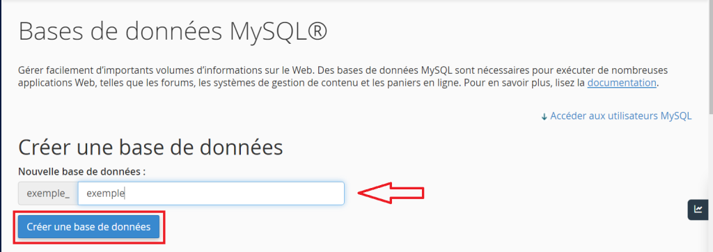 - Sur le champ affiché, entrez le nom de la base de données et cliquez sur « Créer une base de données ».