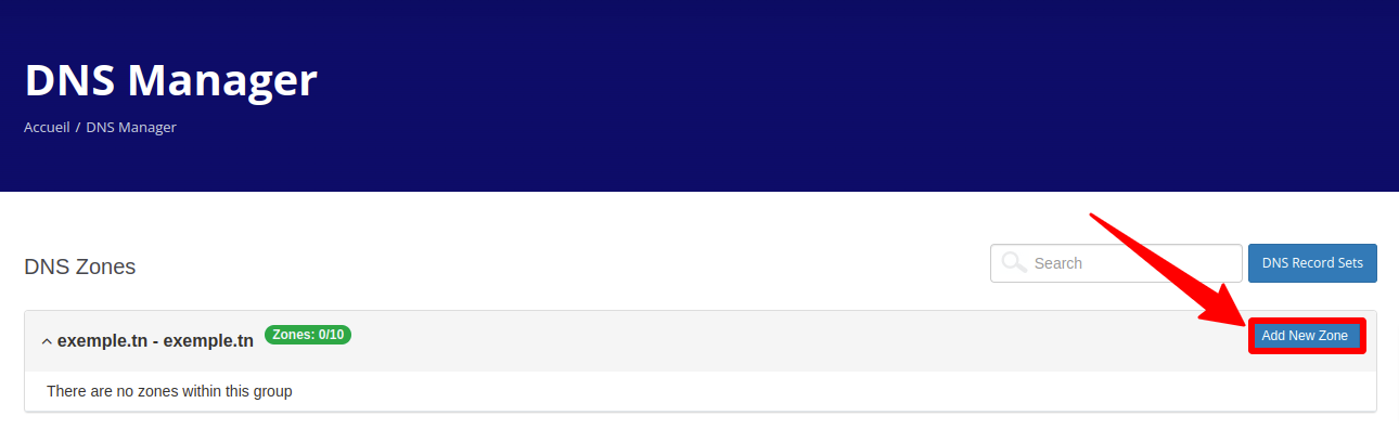 - Cliquez sur le bouton « Add New Zone » devant le nom de domaine en question.