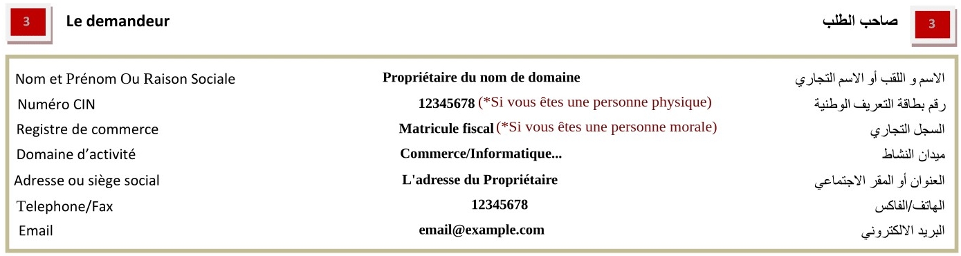 Si vous voulez changer le bureau d’enregistrement d’un nom de domaine ayant l’extension .TN, vous aurez besoin de remplir le Formulaire de demande d’enregistrement d’un nom de domaine Internet en suivent le guide ci-dessous :