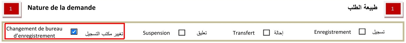 2. Dans la section 1 Nature de la demande : Merci de cocher la case Changement de bureau d’enregistrement.