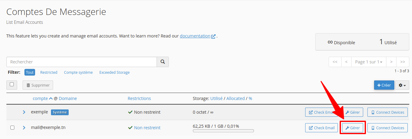 1. Cliquez sur le bouton « gérer » en face de la boite de messagerie concernée.
