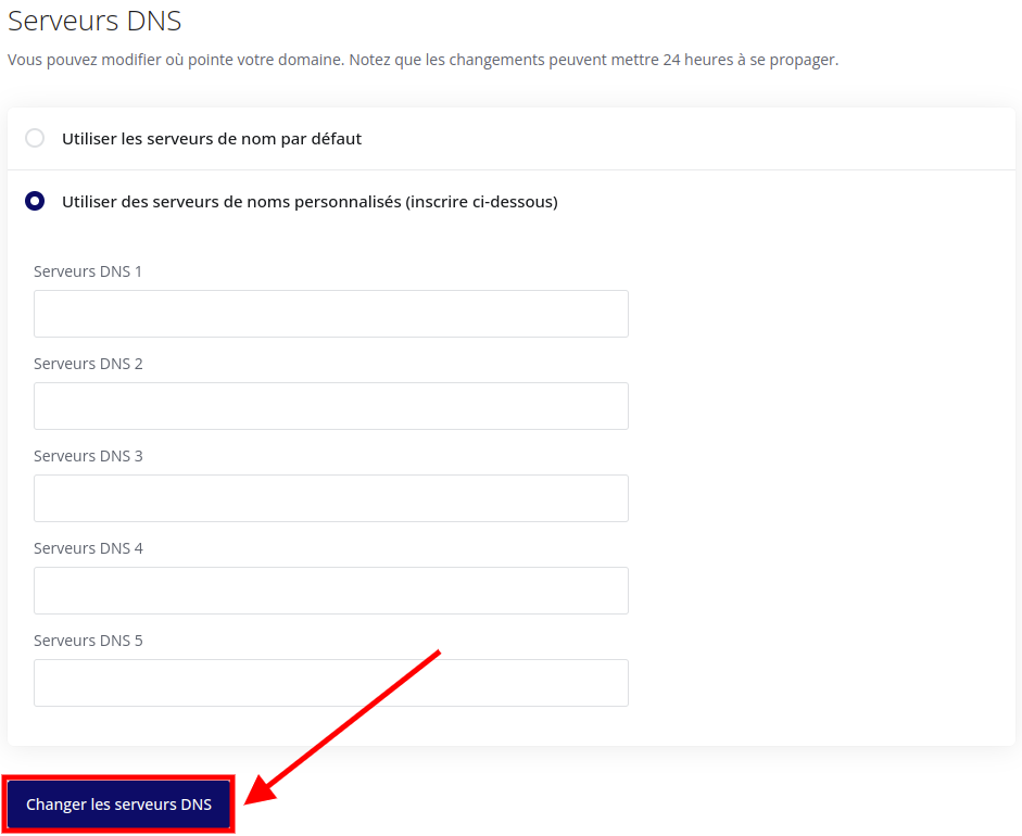 - Ajouter les nouveaux serveurs de noms NS personnalisés, puis cliquer sur « Changer les serveurs DNS« .