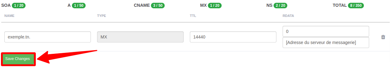 1. Défiler vers le bas et trouvez l’enregistrement « MX » pour la modifier. Puis cliquer sur « Save Changes »