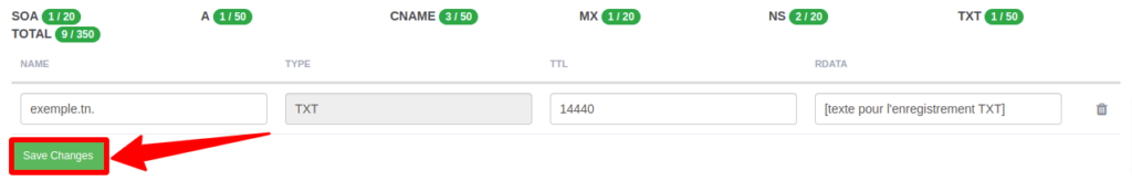 - Défiler vers le bas et trouvez l’enregistrement « SPF » pour la modifier. Puis cliquer sur « Save Changes »